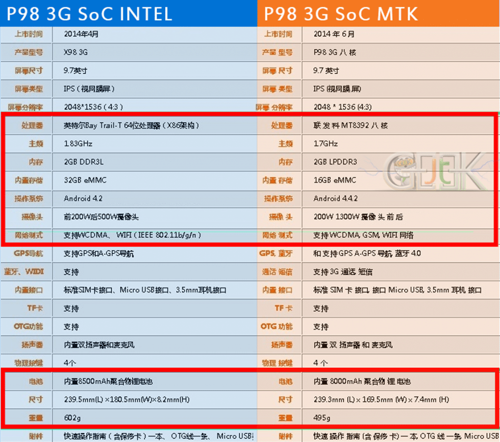 Alors voilà auparavant il y avait la « Teclast X98 3G » et maintenant c’est la « Teclast P98 3G 八核». Comment ça vous ne parlez pas chinois ? Ok bon je vous traduis, 八核 veut simplement dire octacore, car en effet Teclast a renoncé au processeur Intel pour y placer le processeur MediaTek MT8392 le CPU 8 cœur cadencés chacun à 1.7GHz ce qui permettra à Teclast d’apporter d’autre retouche hardware en commençant avec le GPU mali 450, qui va de pair avec les octacore MTK. Bon c’est un peu le bordel mais vous allez comprendre avec un tableau comparatif des specs de l’ancienne version et de la nouvelle version, l’une avec le SoC Intel et l’autre avec le MT8392.